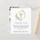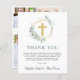Une carte de remerciements de baptême élégante et économique avec une aquarelle illustrant une croix d'or dans une couronne d'or ornée de verdure d'eucalyptus et de "Merci" dans une typographie moderne verte sage. Personnalisez votre message de remerciement et ajoutez vos noms dans un script de calligraphie. Au contraire, ajoutez trois photos et un message de remerciement supplémentaire, bénédiction, citation biblique, etc.