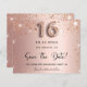 Une fille et tendance Enregistrer la carte Date pour une Sweet 16, 16e anniversaire fête. arrière - plan d'or rose faux métallique décoré d'or rose et de poussière de parties scintillant. Personnalisez et ajoutez une date et un nom/texte. Le texte : Save the Date est écrit avec un grand script de style à la main tendance. Numéro 16 avec une police de style ballon.