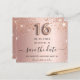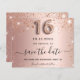 Une fille et tendance Enregistrer la carte Date pour une Sweet 16, 16e anniversaire fête. arrière - plan d'or rose faux métallique décoré d'or rose et de poussière de parties scintillant. Personnalisez et ajoutez une date et un nom/texte. Le texte : Save the Date est écrit avec un grand script de style à la main tendance avec des swashes. Numéro 16 avec une police de style ballon.
