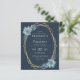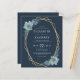 Ce design faire-part de mariage présente un cadre géométrique doré décoré de poinsettias bleu poussiéreux et de verdure hivernale, entourant le texte blanc sur un arrière - plan bleu marine. Le dos de la carte est bleu marine solide.