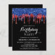 Invitations amis et famille à votre fête d'anniversaire avec ces élégantes parties scintillant patriotiques noir, rouge et bleu goutte des invitations à la fête d'anniversaire et des fournitures de fête. Cette invitation rouge bleu et noir anniversaire est également parfait pour les fêtes de retraite et de graduation et les célébrations, juste changer l'événement dans l'onglet personnalisation. Cette collection d'anniversaire sur le thème du drapeau américain sera un favori de tous les militaires, vétérans, policiers et forces armées, ainsi que des événements d'affaires et d'entreprise. Visitez notre collection patriotique d'anniversaire pour les invitations d'anniversaire rouge blanc et bleu, les faveurs d'anniversaire, les fournitures de fête. DROIT D'AUTEUR © 2020 Judy Burrows, Black Dog Art - Tous droits réservés. Elégante Parties scintillant Rouge Bleu Dérive Patriotique Invitation Anniversaire