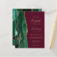 Le bord gauche de cette élégante faire-part de mariage moderne est orné d'une bordure en aquarelle vert émeraude, recouverte d'une parties scintillant en faux or. Le texte personnalisable associe écriture manuscrite dorée, copperplate et polices italiques sur un arrière - plan rouge bordeaux. L'envers est assorti d'une agate vert émeraude et or.
