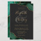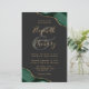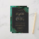 Une aquarelle couleur vert émeraude ornée d'une parties scintillant en faux or apparaît dans deux coins de cet élégant design. Personnalisez-le avec les noms du couple en écriture manuscrite de couleur or sur une grande carte grise. Ajoutez les détails du mariage en cuivre doré et en polices italiques sur un arrière - plan noir en ardoise. L'envers est assorti d'un design d'agate vert et or.