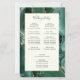 This elegant, modern wedding program features an emerald green agate background trimmed with gold faux glitter. The text appears in elegant emerald green handwriting and copperplate fonts on an ivory rectangle.