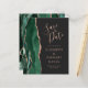 Le bord gauche de cet élégant mariage moderne, à l'exception de la carte de date, est doté d'une bordure en aquarelle vert émeraude, ornée d'une parties scintillant en or rose. Le texte personnalisable combine écriture rose rose, cuivre et polices italiques sur un arrière - plan noir ardoise. L'envers est assorti d'une agate d'or vert émeraude et rose.
