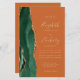 Le bord gauche de cette élégante faire-part de mariage moderne est orné d'une bordure en aquarelle vert émeraude, recouverte d'une parties scintillant en faux or. Le texte personnalisable combine écriture manuscrite dorée, cuivre et polices italiques sur un arrière - plan orange brûlé ou rouille. Ajoutez des détails supplémentaires au verso, ainsi qu'un code QR pour aider vos invités à visiter votre site Web mariage.
