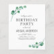 Budget Personnalisez cette Aquarelle Moderne Verdure Eucalyptus Foliage Style Printemps N'importe quel âge fête d'anniversaire Invitation sur arrière - plan blanc avec votre message et détails. Cette invitation élégante comprend un feuillage botanique élégant et moderne avec une typographie stylée est parfait pour Sweet 16, 1er, 21ème, 30ème, 40ème, 50ème, 60ème, 70ème, Anniversaire