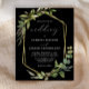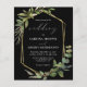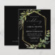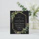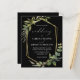 Cette élégante faire-part de mariage rustique présente un cadre géométrique en faux feuille d'or décoré d'eucalyptus et d'oliviers sur un arrière - plan noir. Le mot "mariage" apparaît dans le script calligraphique. Customisez le texte blanc avec les noms de la mariée et du marié et les détails du mariage sur le devant, et leurs initiales et l'URL du site Web au verso.