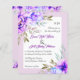 FAIRE-PART DE MARIAGE lilas floral violet BUDGET avec code QR pour RSVP. Il affiche des bouquets de fleurs dans les tons violets et bleus aux coins tandis que votre texte est placé dans un cadre blanc avec une bordure lilas. L'arrière comprend des guirlandes fleuries sur les parties supérieure et inférieure et le code QR pour RSVP.