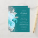 Le bord gauche de cette élégante faire-part de mariage moderne est orné d'un bouquet floral aux tons turquoise et bleu clair, bordé de faux feuillage argenté et de faux feuillage de parties scintillant et parsemé de faux parties scintillant argentée. Le texte personnalisable combine écriture manuscrite gris argenté pâle, copperplate et italique sur un arrière - plan turquoise. L'envers affiche un design floral turquoise et argenté assorti.