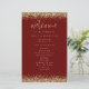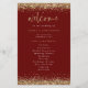 Budget Gold Parties scintillant Bourgogne programme de mariage. Taille 5,5" x 8,5" à un prix abordable, sur un élégant stock LINEN de 110 lb - pour une sensation de luxe à un bon rapport qualité-prix, c'est parfait pour les programmes, ainsi que des invitations et des menus, etc. Cette alternative de taille budgétaire est également disponible dans d'autres choix de papier. Le stock de carte SEMI-GLOSS 110 lb est à peu près de la même épaisseur qu'une carte postale, donc fonctionne bien aussi pour les invitations. Le papier FELT 100 lbs est de couleur bouffante, PAS blanc, donc ajoute une touche rustique. Le stock de papier MATTE 80lbs est blanc vif, pour une impression nette, idéal pour vos menus et programmes, tandis que le papier SATIN 80lbs est mince et léger, idéal pour les enceintes. Ce design élégant a des bordures d'or en faux parties scintillant de chaque côté. Bienvenue est dans un ensemble informel écrit à la main script et le reste des mots que vous pouvez facilement personnaliser.