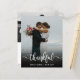 Budget Moderne Mariage Lettré "Merci" Script Photo Merci Cartes. Le modèle mariage moderne élégant avec une photo verticale complète sur le devant avec le texte superposé "Thankful" dans une police de script de typographie lettrée en blanc sur l'image. Ajoutez votre nom personnalisé et un message de remerciement. Si vous préférez écrire votre note à la main, supprimez simplement l'exemple de texte pour gagner de l'espace. Jolie et élégante cartes économiques à bas prix. Si vous avez besoin d'aide, veuillez contacter designer!