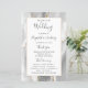 This elegant, modern wedding program fan features a gray and white agate background trimmed with gold faux glitter. The text appears in elegant charcoal gray handwriting and copperplate fonts on a white rectangle.