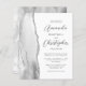 Le bord gauche de cette élégante faire-part de mariage moderne est orné d'une bordure en aquarelle grise et blanche ornée d'une parties scintillant en faux argent. Le texte personnalisable combine le script gris charbon et les polices sans serif sur un arrière - plan blanc. L'envers présente une conception d'agate correspondante.