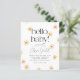 Une élégante invitation au baby shower avec des illustrations de soleil dessinées à la main éparpillées sur la page. Le texte dit "bonjour, bébé !" dans la typographie serif moderne avec le nom de la mère à être dans la calligraphie script. Ci-dessous, les détails de l'événement sont imprimés en caractères gras simples. Il y a une section modèle pour les détails du registre au bas de la carte. Ces cartes retournent à un motif de soleils blancs sur un arrière - plan orange. Ce design est neutre pour le genre et peut être utilisé pour les thèmes "vous êtes mon soleil", "rayon de soleil", et "voici le soleil". Dans le cadre de la sélection du budget sur Zazzle, cette feuille n'est pas une taille invitation standard ou une qualité de papier. Si vous voulez ce design sur une carte d'invitation, vous pouvez le trouver dans la collection ou utiliser le Zazzle Make Machine pour le transférer sur le produit de votre choix. Voir la collection sur cette page pour les articles correspondants ou visitez notre magasin pour plus d'invitations de douches pour bébé soleil!