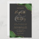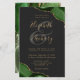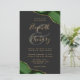 A hunter green watercolor agate design trimmed with faux gold glitter appears in two corners of this elegant design. Personalize it with the couple's names in gold-colored handwriting script over a large gray ampersand. Add the wedding details in gold-colored copperplate and italic fonts on a slate black background. The reverse side features a matching green and gold agate design.