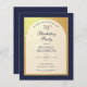 Une invitation d'anniversaire moderne. Sur un arrière - plan rectangulaire bleu marine, il a un faux arc de feuille d'or qui a à l'intérieur du texte bleu marine sur arrière - plan blanc. Les mots fête d'anniversaire sont écrits dans un élégant script calligraphique ; la première ligne est du texte arché.