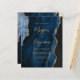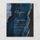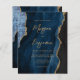 Cette élégante invitation de mariage présente une image arrière - plan d'agate bleu marine d'aquarelle parée de parties scintillant en faux or. Le texte personnalisable combine écriture manuscrite moderne couleur or, cuivre et polices italiques. L'envers présente un design coordonné d'agate bleu marine et or.