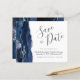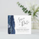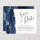 Cet élégant budget enregistrer la carte date dispose d'une bordure marine couleur aquarelle bordé d'une parties scintillant en faux argent. Le texte personnalisable combine le script d'écriture manuscrite gris charbon, les polices cuivre et italique sur un arrière - plan blanc. L'envers est assorti d'un design d'agate bleu marine et argent.