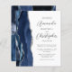 Le bord gauche de cette élégante faire-part de mariage moderne est orné d'une bordure en aquarelle bleu marine ornée d'une parties scintillant en faux argent. Le texte personnalisable combine le script gris charbon et les polices sans serif sur un arrière - plan blanc. L'envers est assorti d'un design d'agate bleu marine et argent.