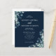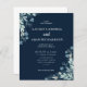 Faire-part de mariage moderne. Avec des fleurs de feuillage rustique et de minuscules fleurs bleues sur un arrière - plan bleu marine. Facile à customiser avec vos informations uniques.