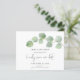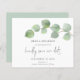 Script Moderne Eucalyptus Enregistrer La Date. Un prix économique PETIT 4,5 po x 5,6 po alternatif. Disponible dans un STOCK SEMI-GLOSS 110 lb CARD qui est l'option par défaut (plus épais pour les invitations), OU un STOCK SATIN FINISH 80 lb THINNER PAPER (idéal pour les boîtiers). Les enveloppes sont en option et légèrement plus grandes que la taille de la carte. Un feuillage minimaliste pour invitation vos invités pour sauver votre date. Veuillez enregistrer notre date dans un script moderne.Le reste du texte que vous pouvez facilement personnaliser. Les couleurs du texte et de l'arrière - plan peuvent être modifiées si vous le souhaitez via l'option personnaliser.