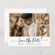 Budget Élégant minimaliste Moderne Typographie Script 3 Collage de photos Enregistrer les cartes de dates en noir et blanc. Ce design romantique et délicat est parfait pour un mariage moderne. Caractéristiques 3 (trois) grille photo collage, une calligraphie whimsical cursive dans la police de style lettré swash queue avec coeur d'amour. Facile à personnaliser avec vos détails et photos mariages. Cartes bon marché à bas prix.