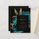 Cette faire-part de mariage élégante et sobre est ornée d'un bouquet luxuriant et romantique à fleurs turquoise avec un faux papier doré et un feuillage de parties scintillant sur un arrière - plan noir. Customisez le texte de couleur or dans des polices stylisées sur un rectangle foncé. L'envers offre de l'espace pour les détails mariages sur un arrière - plan noir solide, ainsi qu'un code QR que les clients peuvent scanner pour visiter votre site Web et RSVP, ce qui permet d'économiser le coût d'impression et d'envoi de cartes RSVP séparées.