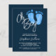 Prévoyez-vous le baby shower d'un garçon ? Ces invitations à la douche bébé budget moderne sont décorées avec Oh Boy! dans la typographie stylisée et les pieds de bébé d'aquarelle mignonne en bleu pastel sur un arrière - plan bleu marine. Facile à personnaliser. Aquarelle originale © Michele Davies.