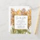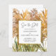 Serez-vous en train de tenir votre cérémonie de mariage dans le sud ou peut-être sur la plage ? Notre budget coloré Save the Date card vous aide à mettre en scène avec un arrangement floral boho abstrait de tiges de pampas dans les tons or, or rose et vert. L'illustration de texte "Enregistrer la date" est définie dans une police de script élégante et tout autre texte à l'avant et à l'arrière de la carte peut être facilement personnalisé par vous sur le modèle.