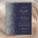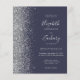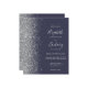 Le bord gauche de cette élégante faire-part de mariage moderne est orné d'une bordure en faux parties scintillant argenté. Le texte personnalisable combine écriture gris argenté pâle, copperplate et polices italiques sur un arrière - plan bleu foncé. L'envers est assorti d'un design bleu foncé et argenté.