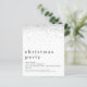 Invitation de la fête de Noël Confetti Parties scintillant d'argent. Un prix économique PETIT 4,5 po x 5,6 po alternatif. Disponible dans un STOCK CARTE SEMI GLOSS 110 lb qui est l'option par défaut (recommandé pour les invitations), OU un STOCK PAPIER THINNER SATIN FINISH 80 lb (idéal pour les boîtiers). Les enveloppes sont en option et légèrement plus grandes que la taille de la carte. L'en-tête est grand en minuscule élégant avec les détails en dessous. Beaucoup d'espace blanc pour une ambiance contemporaine et une bordure de parties scintillant en argent de style confetti au sommet des deux côtés. Personnalisez facilement le texte à vos propres détails.