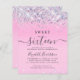 Invitation à la fête du 16e anniversaire pour une fille abordable avec un holographe brillant violet, rose et argent faux parties scintillant confetti contre un arrière - plan rose et "Sweet sixteen" dans un mélange d'élégante typographie gris doux et un script tendance avec des swashes.