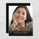 Faire-part moderne de graduation avec une photo verticale personnalisée. Les mots "classe de" apparaissent dans le script de faux feuille d'or, suivi de l'année de classe modifiable dans la police serif ouverte de couleur or. Ajoutez le nom du diplômé et l'école ci-dessous en blanc sans serif police. Remplacez facilement l'image de l'échantillon par la photo de votre diplômé. Un écran de dégradé noir permet de s'assurer que le texte s'affiche. L'inverse est noir. Idéal pour obtenir un diplôme d'études secondaires ou collégiales.