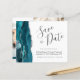 Cet élégant budget enregistrer la carte date dispose d'une bordure d'aquarelle bleue turquoise découpée avec une parties scintillant en faux argent. Le texte personnalisable combine le script d'écriture manuscrite gris charbon, les polices cuivre et italique sur un arrière - plan blanc. Remplacez facilement l'exemple d'image au dos par votre propre photo horizontale.