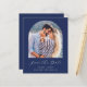 Cette simple et minimaliste carte Save the Date présente une arche photo boho au-dessus des mots "Save the Date" dans un élégant script d'écriture manuscrite blanche, suivi des noms du couple, date mariage et ville en sans serif police sur un arrière - plan bleu marine. Ajoutez un message plus détaillé avec des informations supplémentaires sur l'inverse.