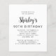 L'avant de cette invitation à l'anniversaire de 90 ans présente la photo de l'invité d'honneur avec une superposition en noir. Le mot "applaudissements" apparaît dans un élégant script de calligraphie, suivi de "à 90 ans" et l'invité d'honneur du nom et de l'anniversaire en sans serif font. Un écran blanc aide à faire apparaître le texte. Customisez le côté opposé avec le nom et les détails de la fête sur un arrière - plan blanc. Un excellent moyen de célébrer quelqu'un qui a quatre-vingt-dix ans ! (REMARQUE : les enveloppes ne sont pas incluses automatiquement dans cette invitation budgétaire. Pour ajouter des enveloppes à votre commande, utilisez le menu déroulant "Enveloppes".)
