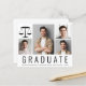 Faire-part de remise de diplômes d'une faculté de droit moderne et abordable avec une illustration des échelles de justice, un collage photo de 4 images, "Graduate" écrit en bas dans de grandes lettres capitales et son nom, école de droit et année de classe en simple typographie. Au contraire, ajoutez les détails de la fête principale.