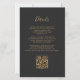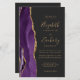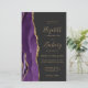 Le bord gauche de cette élégante invitation de mariage moderne présente une bordure d'agate aquarelle violette taillée avec une fausse étincelle dorée. Le texte personnalisable combine une écriture manuscrite dorée, des polices copperplate et italique sur un fond noir cassé. Ajoutez des détails supplémentaires au dos, ainsi qu'un code QR pour aider vos invités à visiter votre site web de mariage.