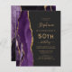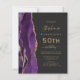 Le bord gauche de cette élégante invitation moderne à la fête du 50e anniversaire comporte une bordure d'aquarelle violette ornée d'une fausse parties scintillant dorée. Le texte personnalisable combine écriture manuscrite dorée, cuivre et polices italiques sur un arrière - plan noir ardoise. L'envers est assorti d'une agate violette et dorée.