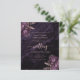 This elegant wedding invitation features purple floral bouquets set off with rose gold faux foil greenery in two corners, on a background image of purple watercolor agate. The customizable rose pink text combines serif, italic and handwriting fonts. The reverse side provides space for wedding details, along with a QR code guests can scan to visit your website and RSVP.