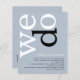 Un rapport qualité-prix BUDGET alternative sur une taille plus petite 4,5 x 5,6" semi-brillant poids 110lbs, qui est d'une épaisseur similaire à une carte postale (cependant ne convient pas à l'utilisation comme carte postale.) VEUILLEZ NOTER qu'il y a UN invitation par feuille. BUDGET Simple QR code Dusty Blue Texte Mariage Invitation. Ajoutez votre code QR à votre site Web mariage au verso afin que vos invités puissent RSVP et voir tous les détails en ligne sans avoir besoin de pièces jointes séparées. Un design typographique moderne avec We Do en grande typographie en blanc avec le "d" en noir, tourné et à gauche sur un arrière - plan de bleu clair poussiéreux. Les couleurs Arrière - plans et textuelles peuvent être modifiées si vous le souhaitez via Personnaliser.