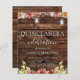 Budget Rustic Country Outdoors on Dark Wood with Burgundy, Orange and Yellow Sunflowers with Mason Jars on String Light Automne ou Automne Quinceanera Celebration Party Invitations - comprend une belle et élégante typographie de script pour la fête d'anniversaire spéciale.