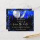 Un arrière - plan noir décoré de gouttes bleues royales, confettis et ballons. Personnalisez et ajoutez une date et un nom/âge. Le texte : Save the Date est écrit avec un grand script de style à la main tendance.