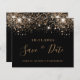 Une petite fille et tendance Enregistrer la carte Date pour une Quinceañera, 15e anniversaire fête. Un arrière - plan noir décoré de parties scintillant en faux or. Modèles pour une date, un nom et un texte. Lettres de couleur dorée. Le texte : Save the Date est écrit avec un grand script de style à la main tendance.