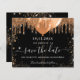 Une petite fille et tendance Enregistrer la carte Date pour une Quinceañera, 15e anniversaire fête. Un arrière - plan noir classique décoré de parties scintillant et de ballons en faux or. Personnalisez et ajoutez une date et un nom/âge. Le texte : Save the Date est écrit avec un grand script de style à la main tendance.