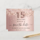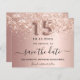 Une petite fille et tendance Enregistrer la carte Date pour une Quinceañera, 15e anniversaire fête. arrière - plan d'or rose faux métallique décoré d'or rose et de poussière de parties scintillant. Personnalisez et ajoutez une date et un nom/texte. Le texte : Save the Date est écrit avec un grand script de style à la main tendance avec des swashes. Numéro 15 avec une police de style ballon.