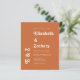 Ce faire-part de mariage rétro moderne présente du texte blanc cassé sur un arrière - plan orange brûlé. Ajoutez les noms et les initiales monographiques de la mariée et du marié dans la typographie rétro stylisée et les détails dans la police sans serif. L'envers est une teinte d'orange brûlé.