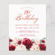 Roses rouges et pivoines roses rousses sont nichées dans des feuilles vert foncé sur cette magnifique et unique invitation à l'anniversaire.