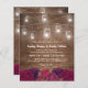 Invitations de mariages campagnards rustiques budget avec un arrière - plan en bois, des fleurs de marsala bordeaux rouges, des jarres de maçon avec des lampes à cordes et un élégant modèle mariage modifiable.